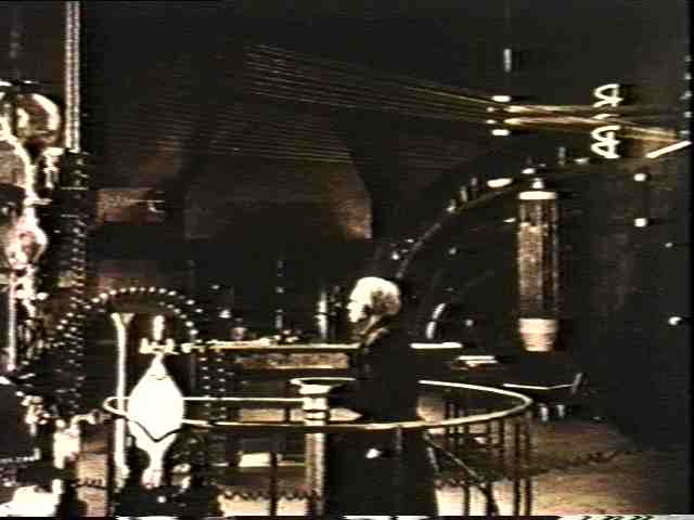 Rotwang's laboratory is a mess of electrical and chemical equipment. The scientist himself is working now while his creation, a robotic woman, sits further back.
