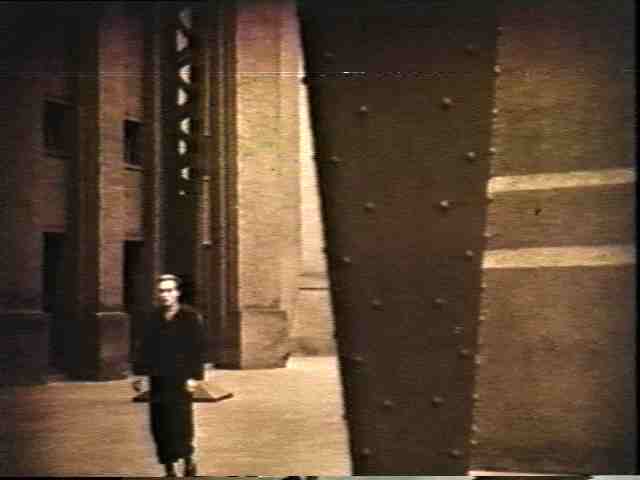 The air is thick with trapped smog. The buildings above cast shadows that fill most of the alley. There is a strange thatched house ahead.