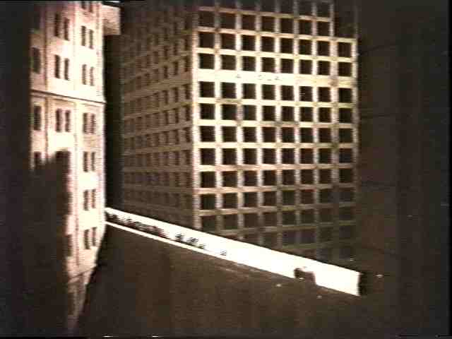 No longer restricted to two-dimensions, pedestrians in Metropolis take advantage of high-altitude tunnel bridges. There are two major buildings nearby, one classical in form and the other more modern.